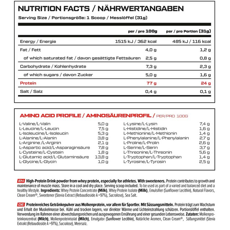 - Kombination aus schnell verfügbarem, kaltfiltriertem Whey-Protein-Isolat und -Konzentrat